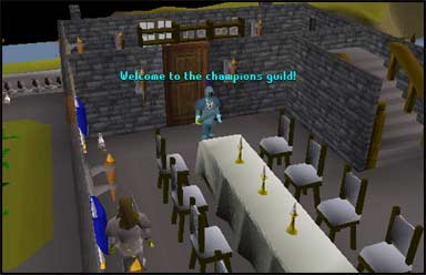 The Champions' Guild is located in central Misthalin, south-west of Varrock. To enter, you'll need 32 quest points (i.e., completed most of the F2P quests). Upon entering, you'll be greeted by the Guildmaster; brave and noble, he oversees all goings-on in the guild. He is also the first NPC you must talk to in order to begin the Dragon Slayer quest. Ground levelHere you'll find two fonts for washing your hands, before sitting down at the lavish longtable for a banquet. There is an enclosed chicken coop, and with the kitchen range next door, this is an excellent place to raise your cooking level pretty easily.