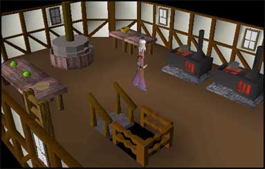 Top floorOn this floor you can put grain in the hopper and operate the controls to grind flour. You can also collect items for making wine. Spawns in purple: Cooking apple, Jug, Pot, Grapes. Pie Shop (members only)Back down on the ground floor, Romily Weaklax sells pies. His prices are listed in the table below. He also sells a recipe book for making pies. Note that multiple pie ingredients must be added in the exact order listed. You can't mess up - it just won't let you add ingredients in the wrong order. The Pies section of the Cooking Skill Guide discusses pies and exactly how to make them. For example, fish must be cooked before they are added to pies. Also, pies are eaten in two bites.