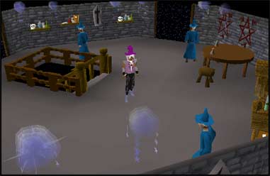 The most important person on the ground floor is the Wizard Distentor. He is the head of the guild, and can teleport you to the rune essence mine. This is the portal most members use to access the rune essence mine because it is the closest to a bank, namely Yanille bank.